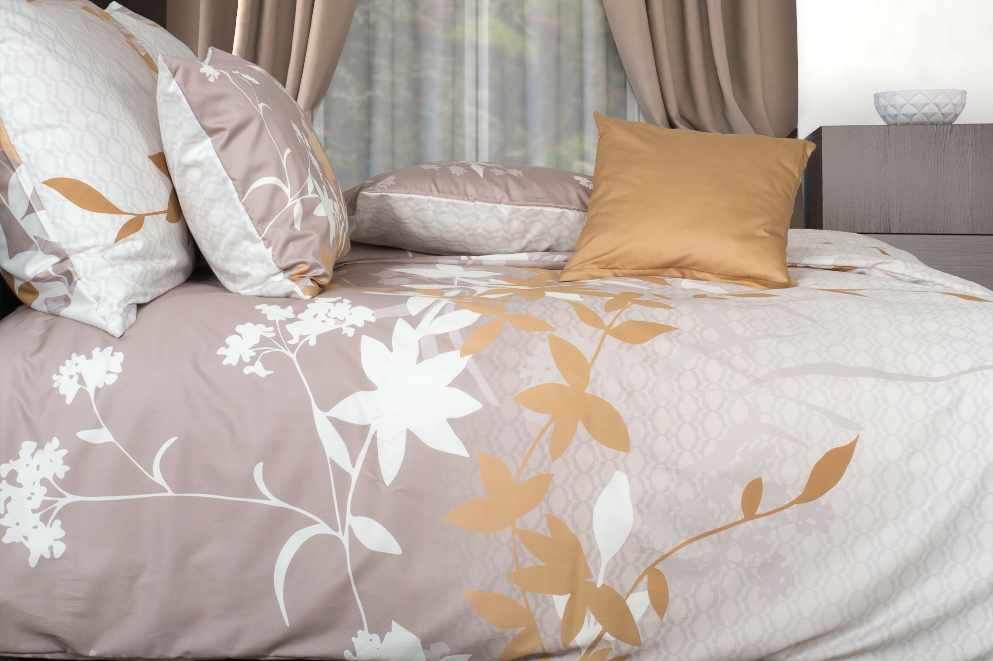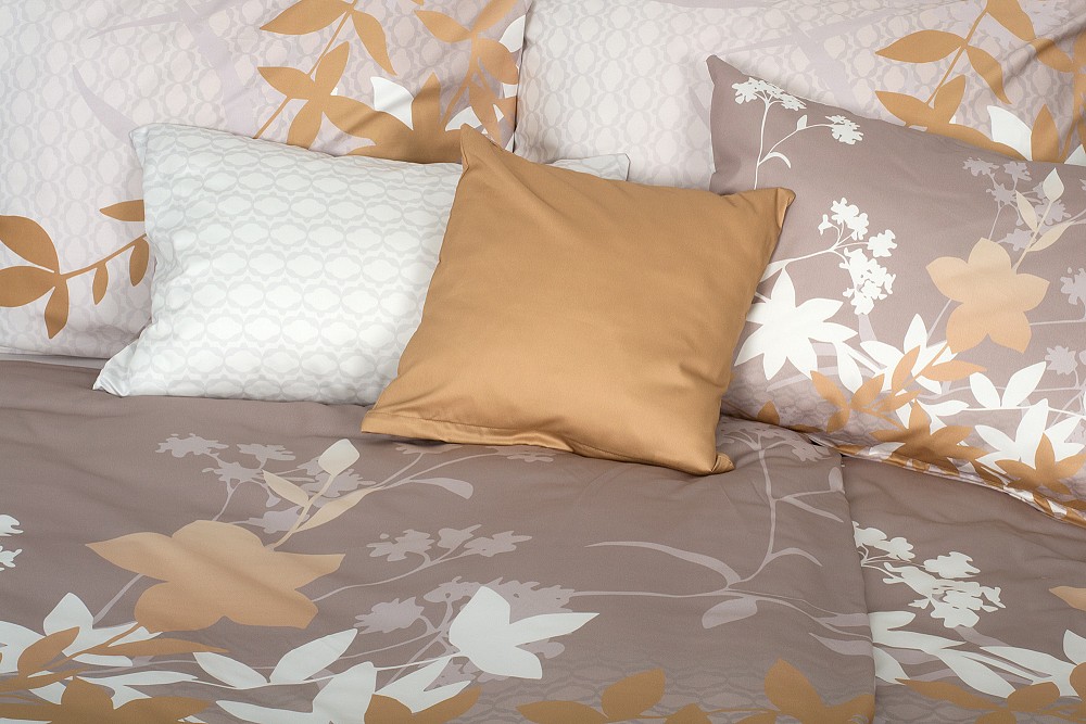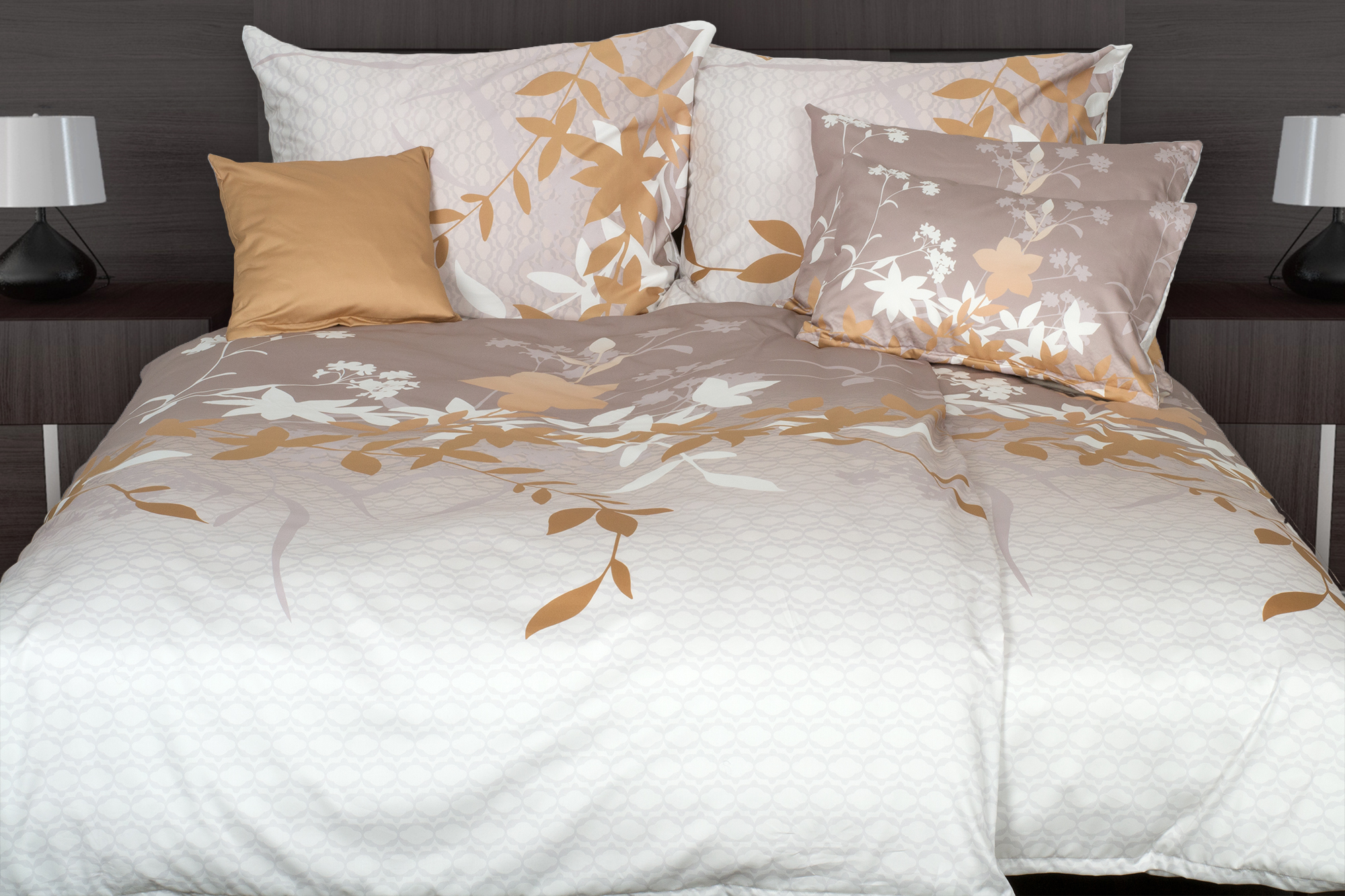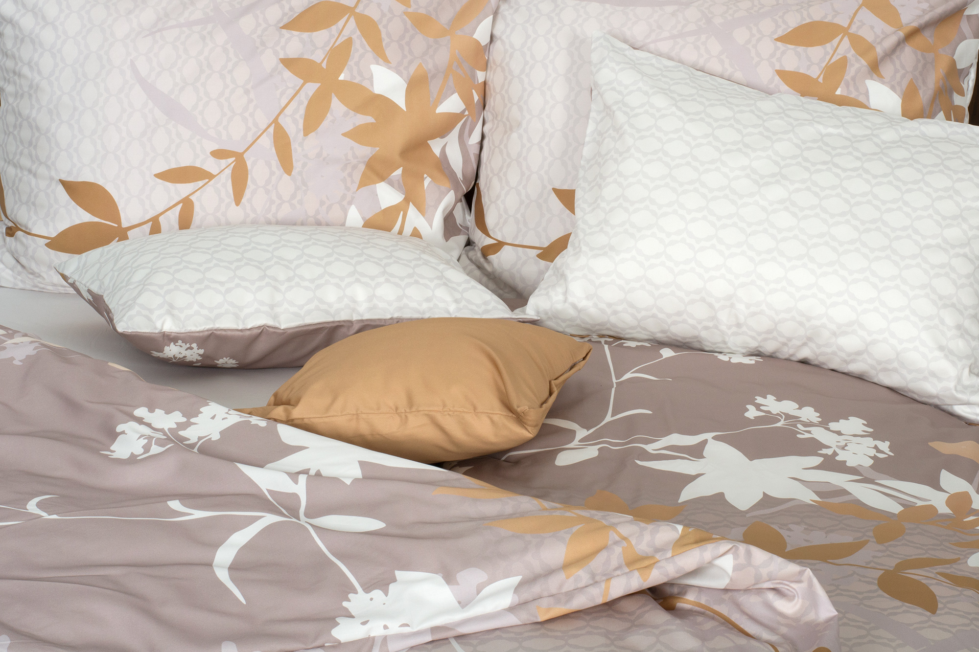 Zarte sandgraue Bettwäsche mit abstrakten Blumen und Blättern.