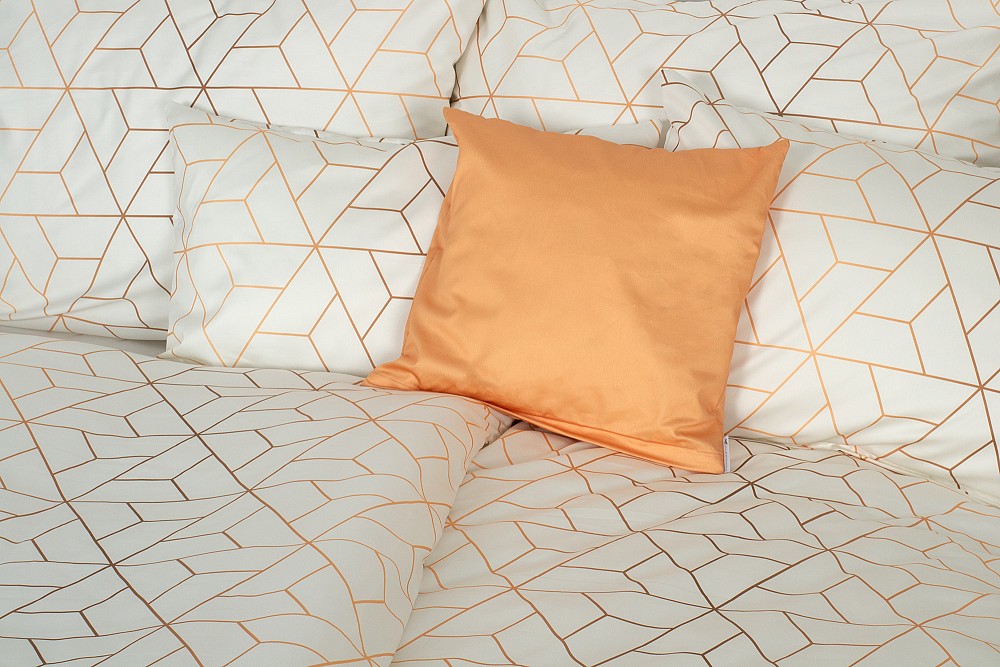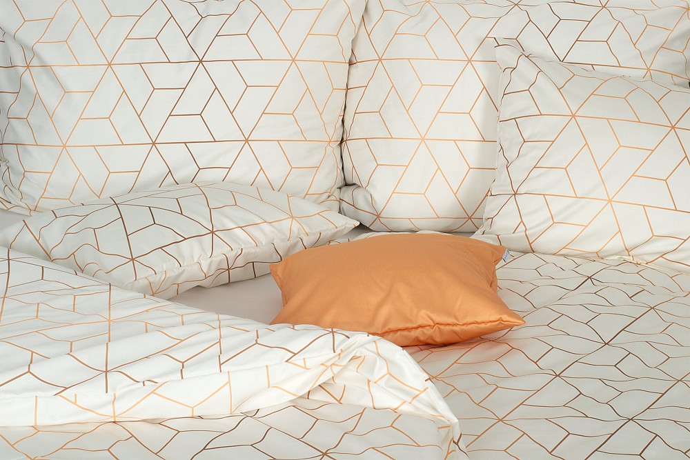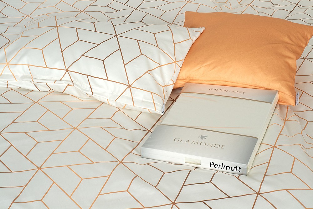 Der weiße Hintergrund der Bettwäsche ist mit einem sich regelmäßig wiederholenden geometrischen Motiv in Goldtönen bedeckt. Das zart schimmernde Material verleiht der Bettwäsche einen Hauch von Luxus.