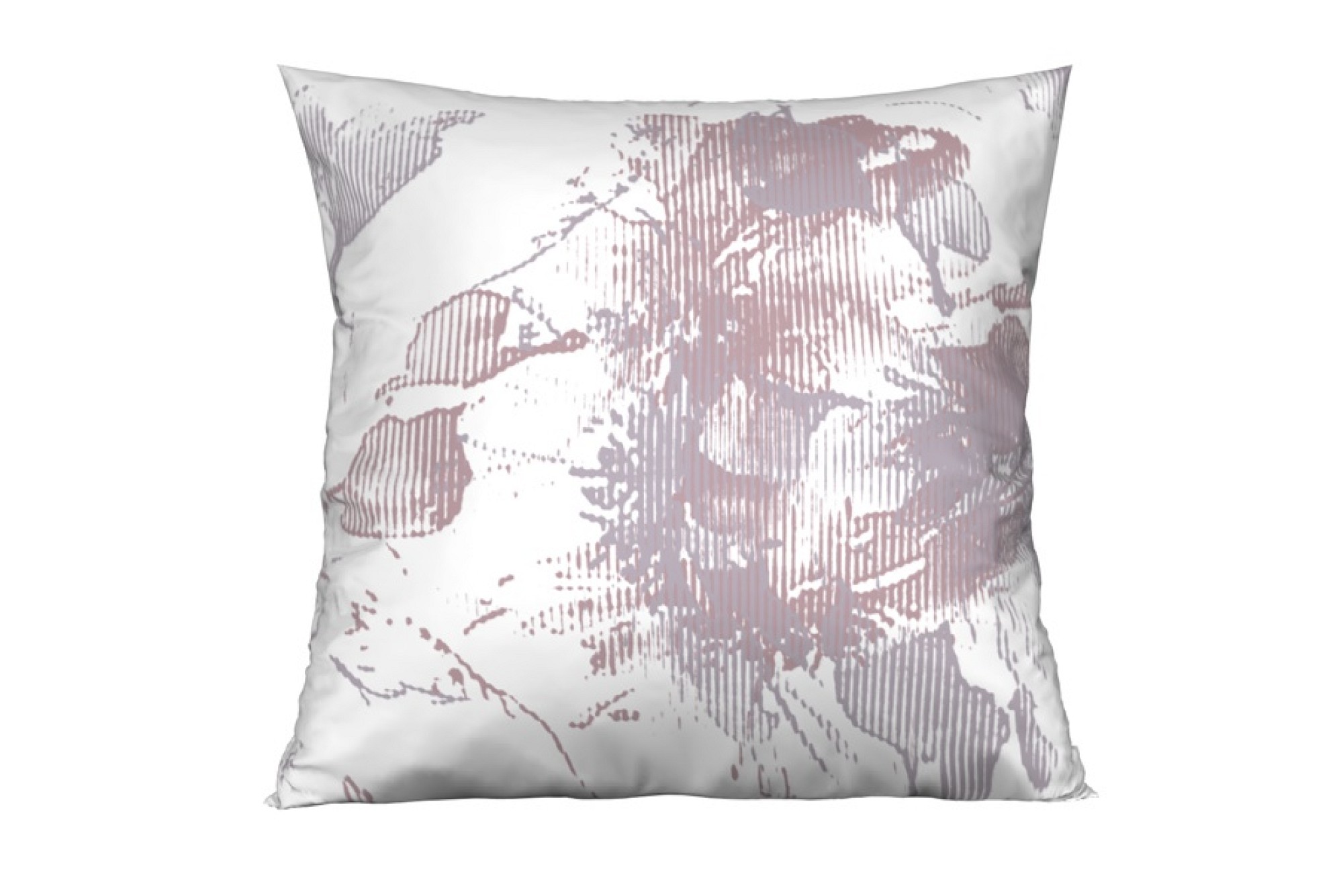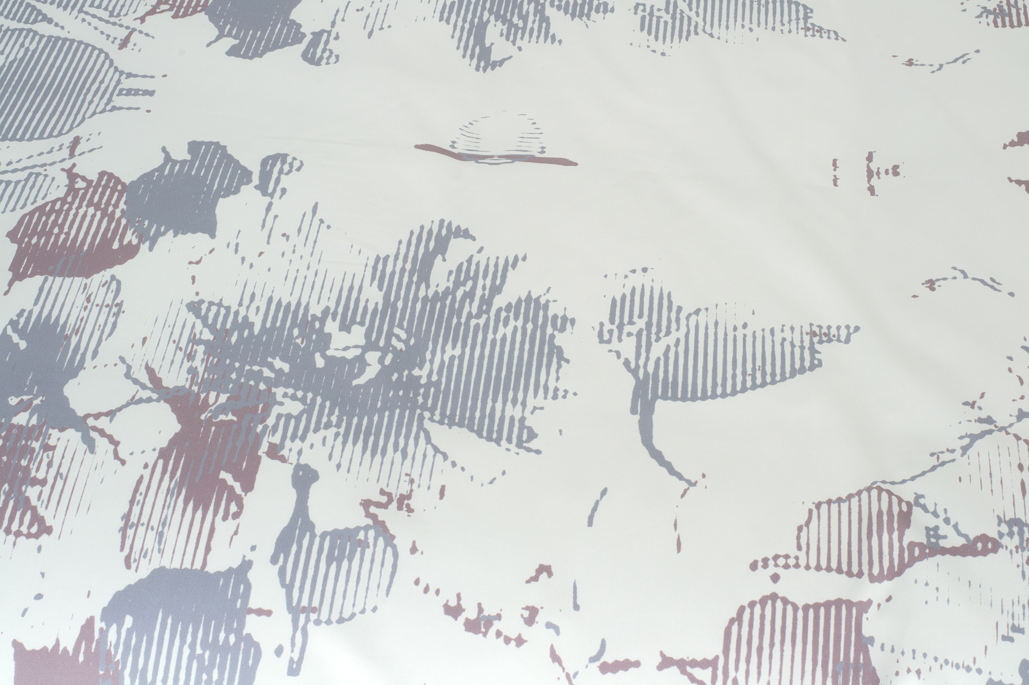 Auf cremeweißem Hintergrund erstreckt sich ein abstraktes Muster in Grau- und Braunvioletttönen. Das Muster wird durch vertikale weiße Linien belebt.