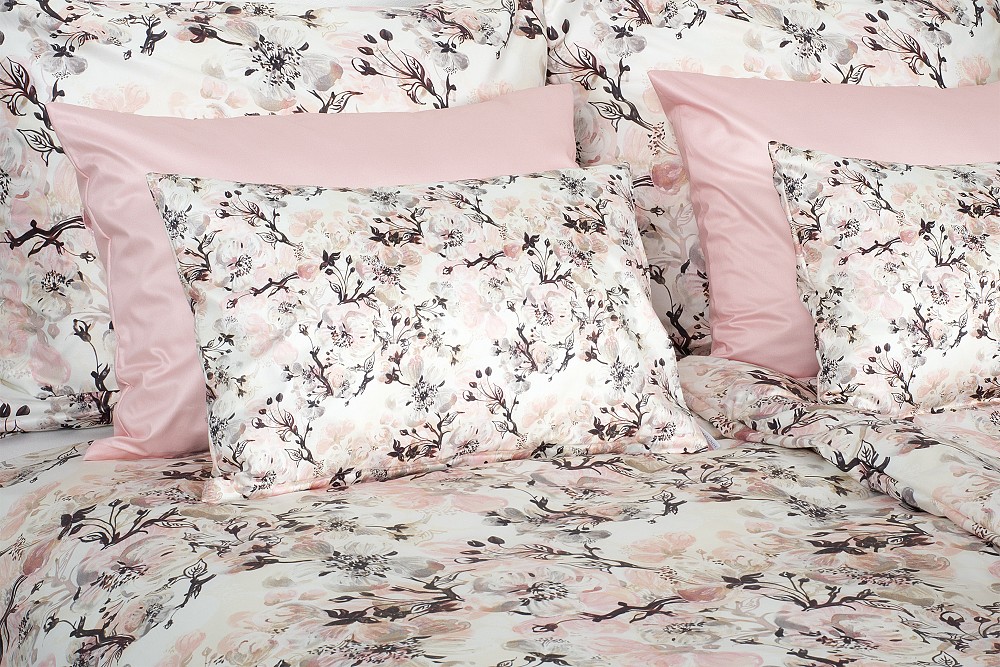 Bettwäsche mit zarten rosafarbenen Blüten auf Zweigen