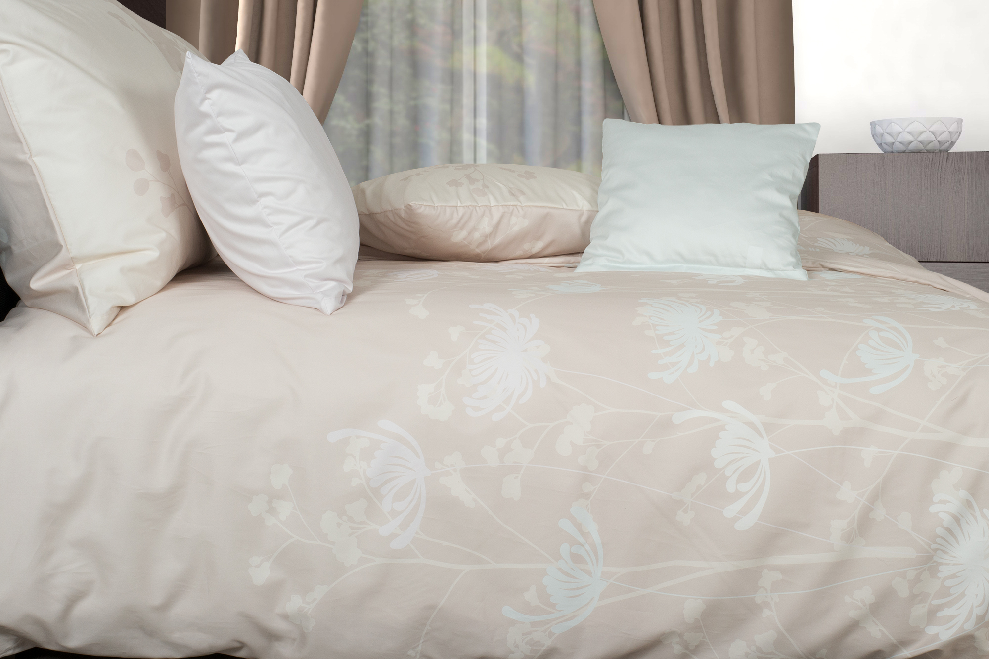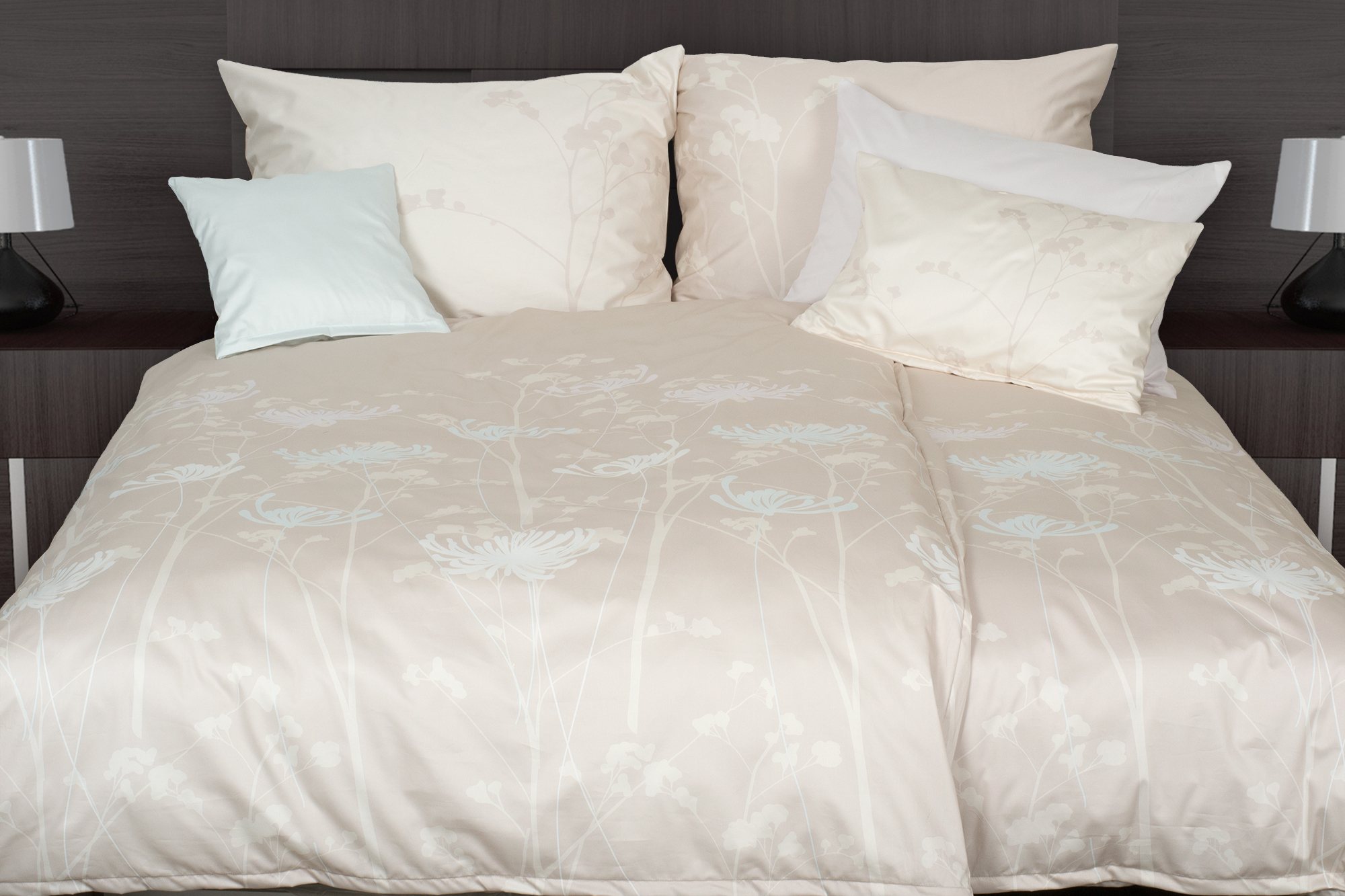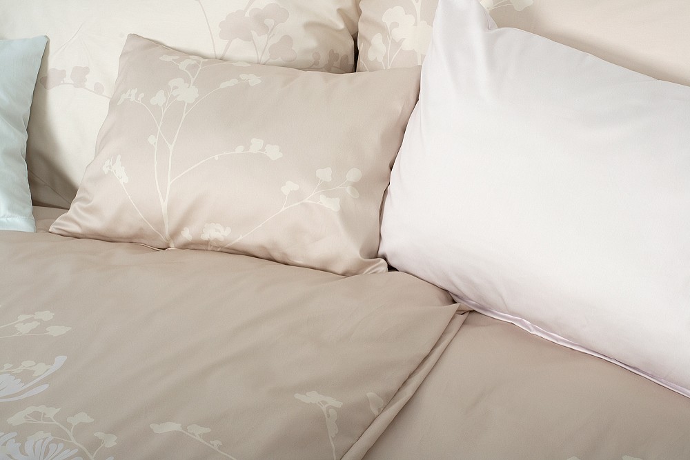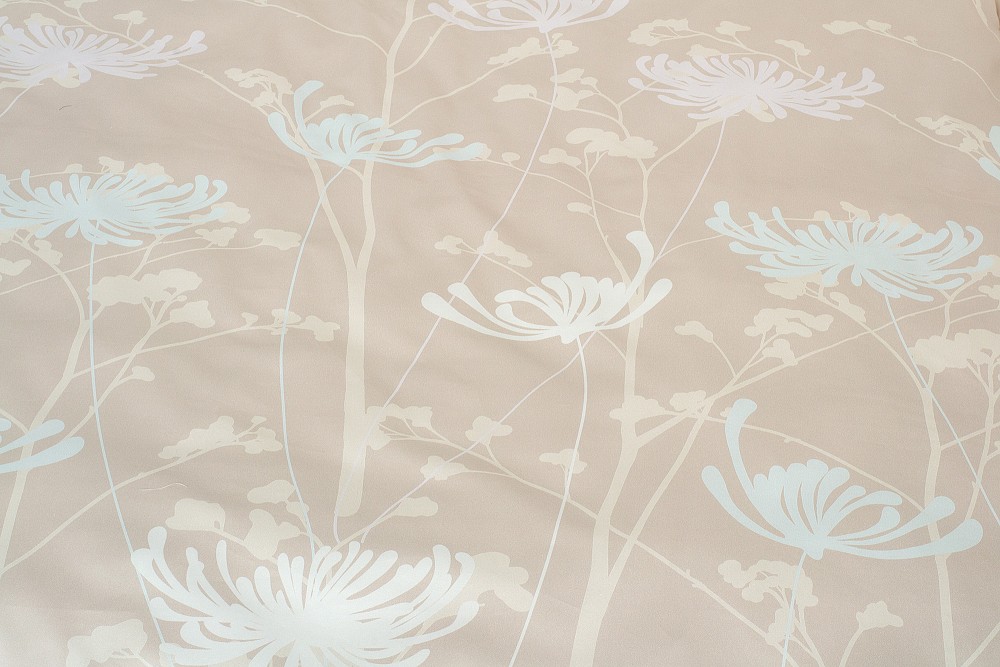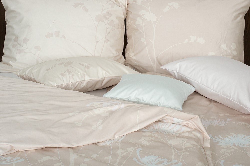 Pastellfarbene Blüten, so gewichtslos wirkend, als hätte man einen heiteren Traum auf den beigen Stoff übertragen. Sie können beide Seiten dieser Bettwäsche benutzen bzw. nach oben legen, sie sind unterschiedlich gestaltet.