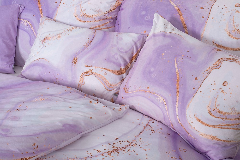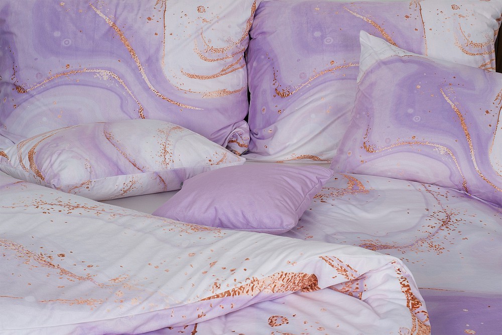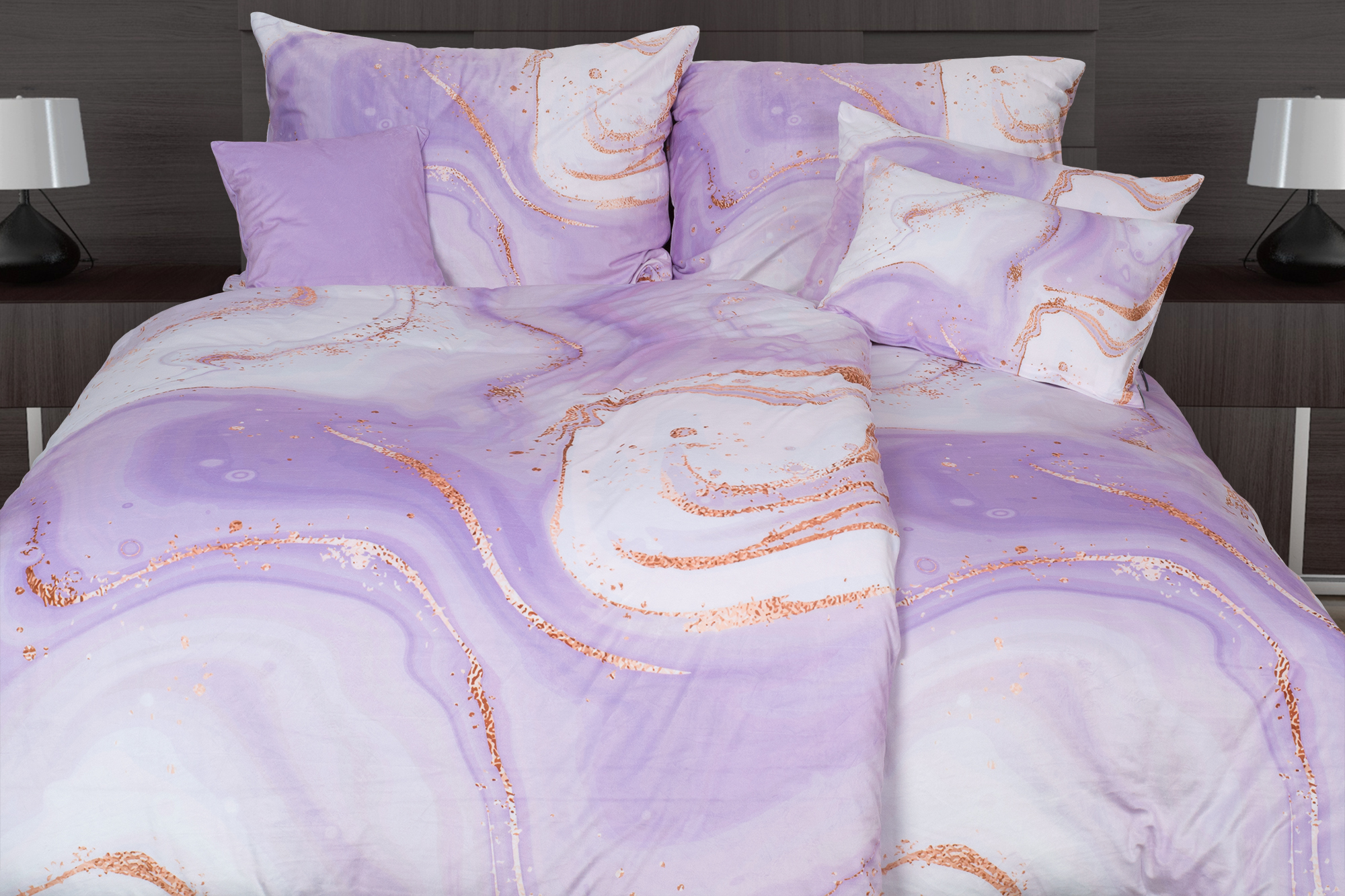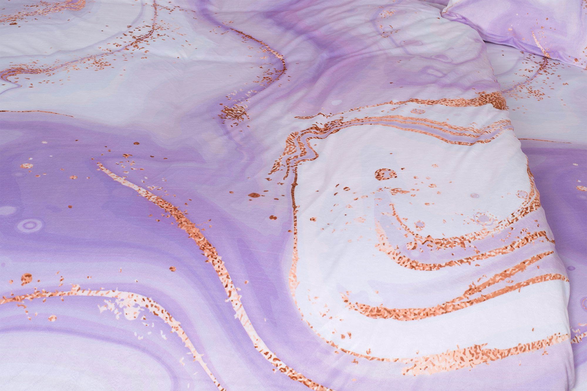 Sanft ineinanderfließende Wellen in Violetttönen werden durch zufällig angeordnete Linien in Kupferfarbe belebt.