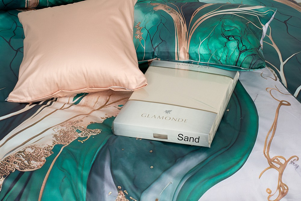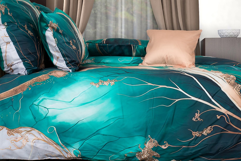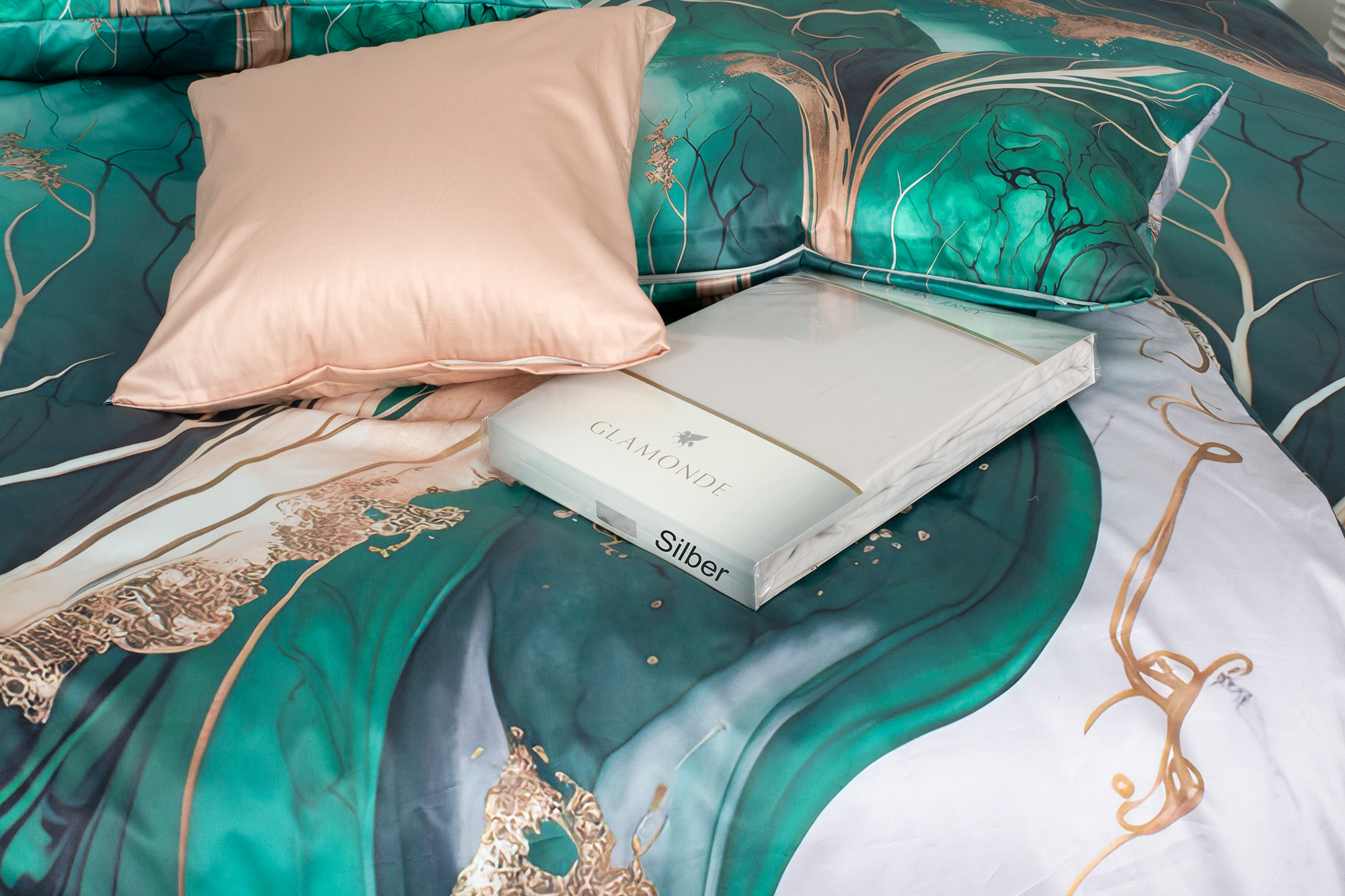 Die Kombination aus dunklen Grüntönen und Weiß wird durch eine goldene Ader von unterschiedlicher Intensität aufgehellt, die sich durch die gesamte Oberfläche der Bettwäsche zieht.