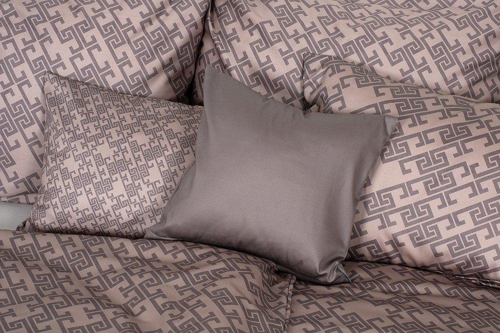 Das braune Muster mit einem griechischen Motiv ist gleichmäßig über die gesamte Fläche der Bettwäsche verteilt. Die einfarbig braunen Zierkissen, die Sie ebenfalls bei uns kaufen können, bilden ein harmonisches Ganzes mit der Bettwäsche.